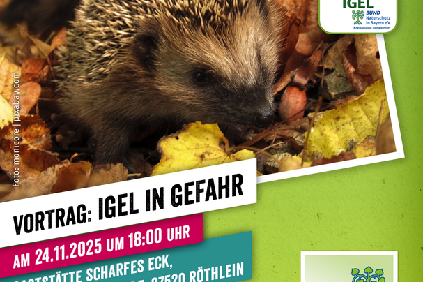 | 24.11.2025 18:00 - 19:30 | Vortrag: Igel in Gefahr | Gaststätte Scharfes Eck, Mühläckerstrasse 7, 97520 Röthlein | Vortrag |