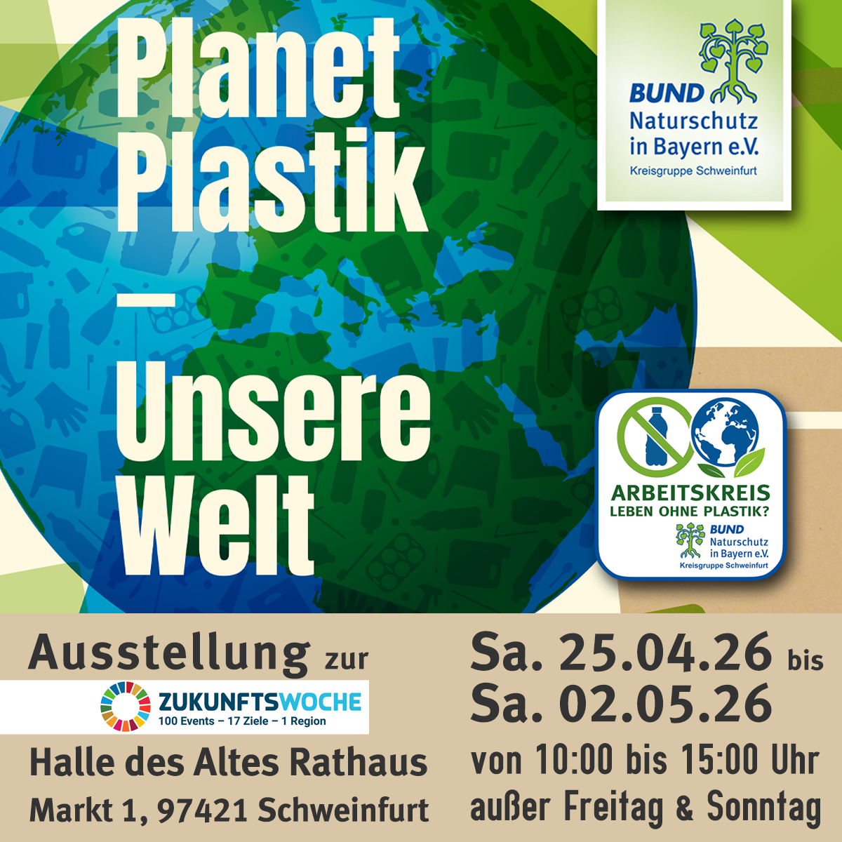 Am Samstag, den 25.4.2026 haben wir in Schweinfurt auf dem Marktplatz im Rahmen der Zukunftswoche auch einen Infostand zum Thema Plastik in der Umwelt. Die Ausstellung Planet Plastik ist dann bei gutem Wetter direkt am Stand zu sehen. Bei Regen kann sie in der Rathaushalle besichtigt werden. Geöffnet ist die Ausstellung in der Rathaushalle von Montag bis Samstag von 10:00 bis 15:00. Feiertag und Sonntag ist sie geschlossen.