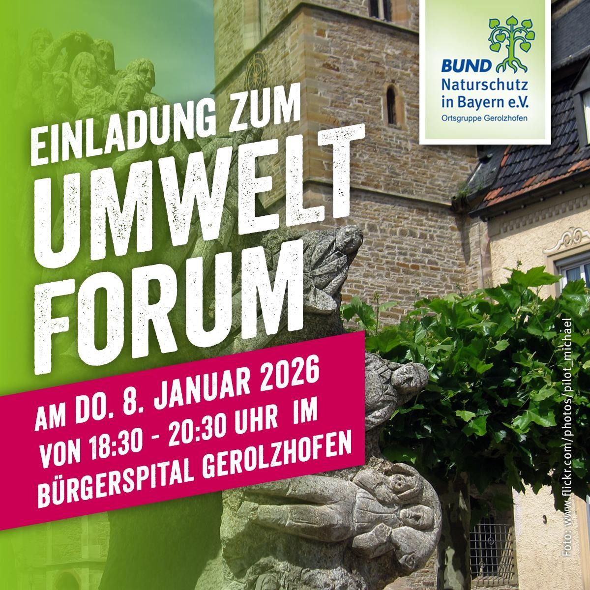 Den Auftakt macht das erste Umweltforum am **Donnerstag, 8. Januar 2026**, von **18.30 bis 20.30 Uhr** in der **Minnesängerstube des Bürgerspitals Gerolzhofen**. Mach mit – bring dein Wissen und deine Ideen ein!