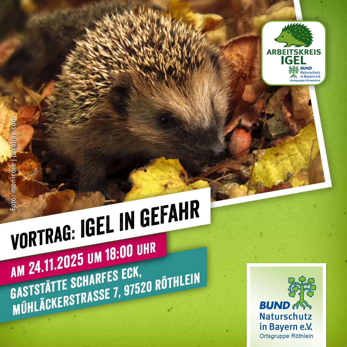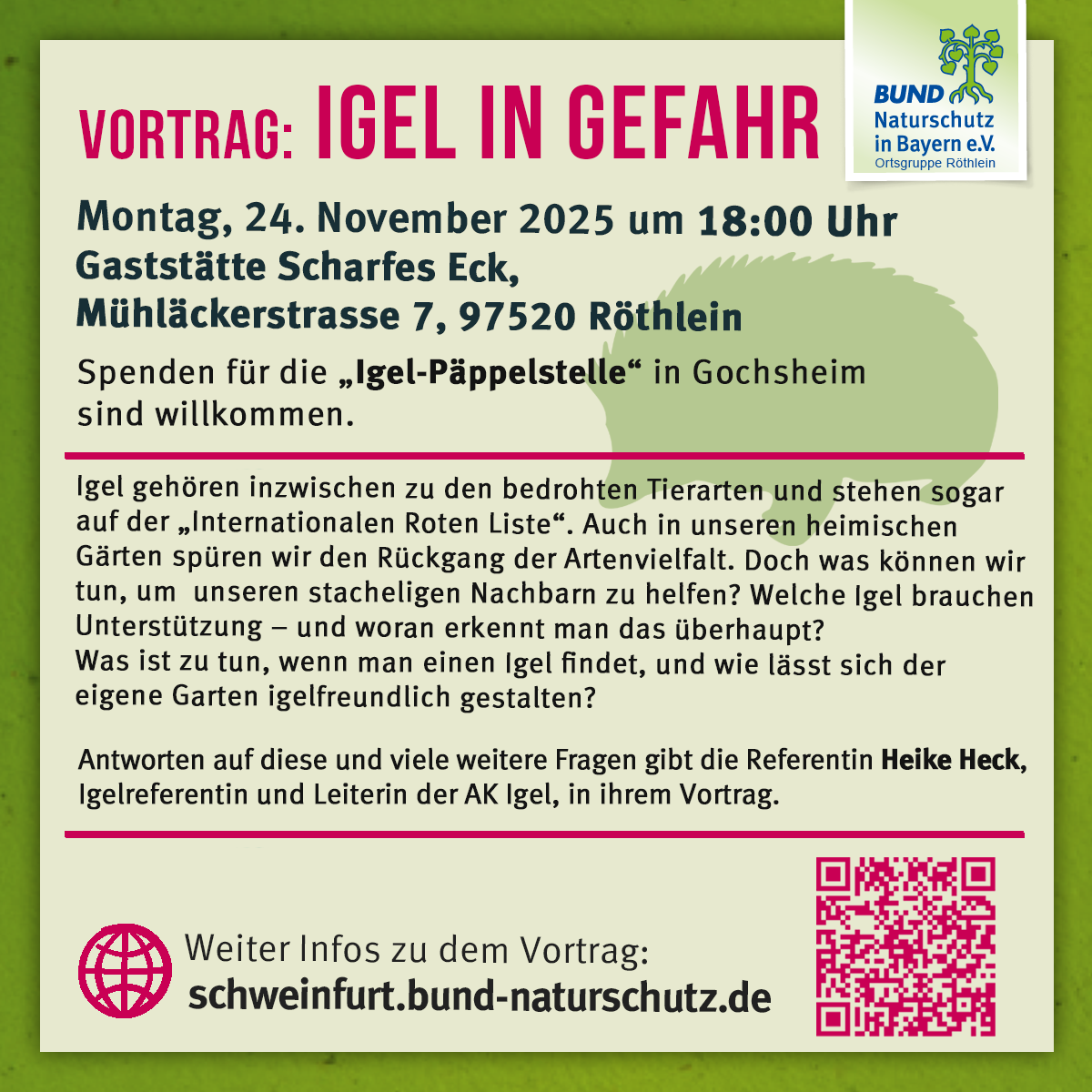 Igel sind in Gefahr. Sie gehören zu den bedrohten Tierarten und stehen sogar auf der „Internationalen Roten Liste“. Auch in unseren Gärten merkt man, dass es weniger Tiere gibt. Aber was können wir tun, um den Igeln zu helfen? Welche Igel brauchen Unterstützung – und woran erkennt man das? Was soll man tun, wenn man einen Igel findet? Und wie kann man den eigenen Garten so gestalten, dass er für Igel gut ist? Antworten auf diese Fragen gibt Heike Heck. Sie ist Igel-Expertin und leitet die Gruppe AK Igel. In ihrem Vortrag erklärt sie alles anschaulich und leicht verständlich. Die Ortsgruppe Röthlein sammelt bei der Veranstaltung Spenden. Das Geld geht an die „Igel-Päppelstelle“ in Gochsheim. Diese private Initiative pflegt schwache und verletzte Igel. Damit sie weiterhelfen kann, braucht sie finanzielle Unterstützung.