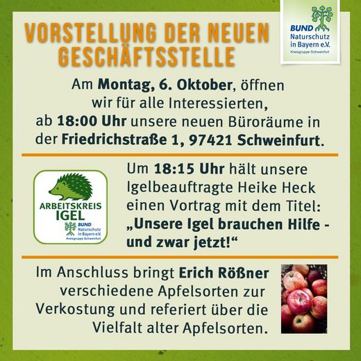Wir öffnen für alle Interessierten unsere neuen Geschäftsräume. Unsere Igelbeauftragte Heike Heck informiert in Ihrem Vortrag: “Unsere Igel brauchen Hilfe - und zwar jetzt”, warum der Igel Probleme hat und wie jeder und jede helfen kann. Außerdem bring Erich Rößner seine Apfelsammlung mit und informiert über die vielfältigen Apfelsorten.