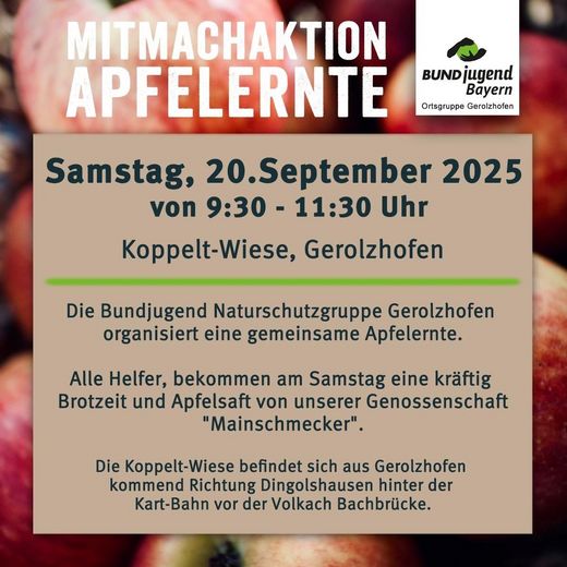 Die Bundjugend Gerolzhofen organisiert eine gemeinsame Apfelernte. Die Äpfel werden zu unserer Genossenschaft Main-Streuobst-Bienen eG gebracht und dort zu Saft gepresst.