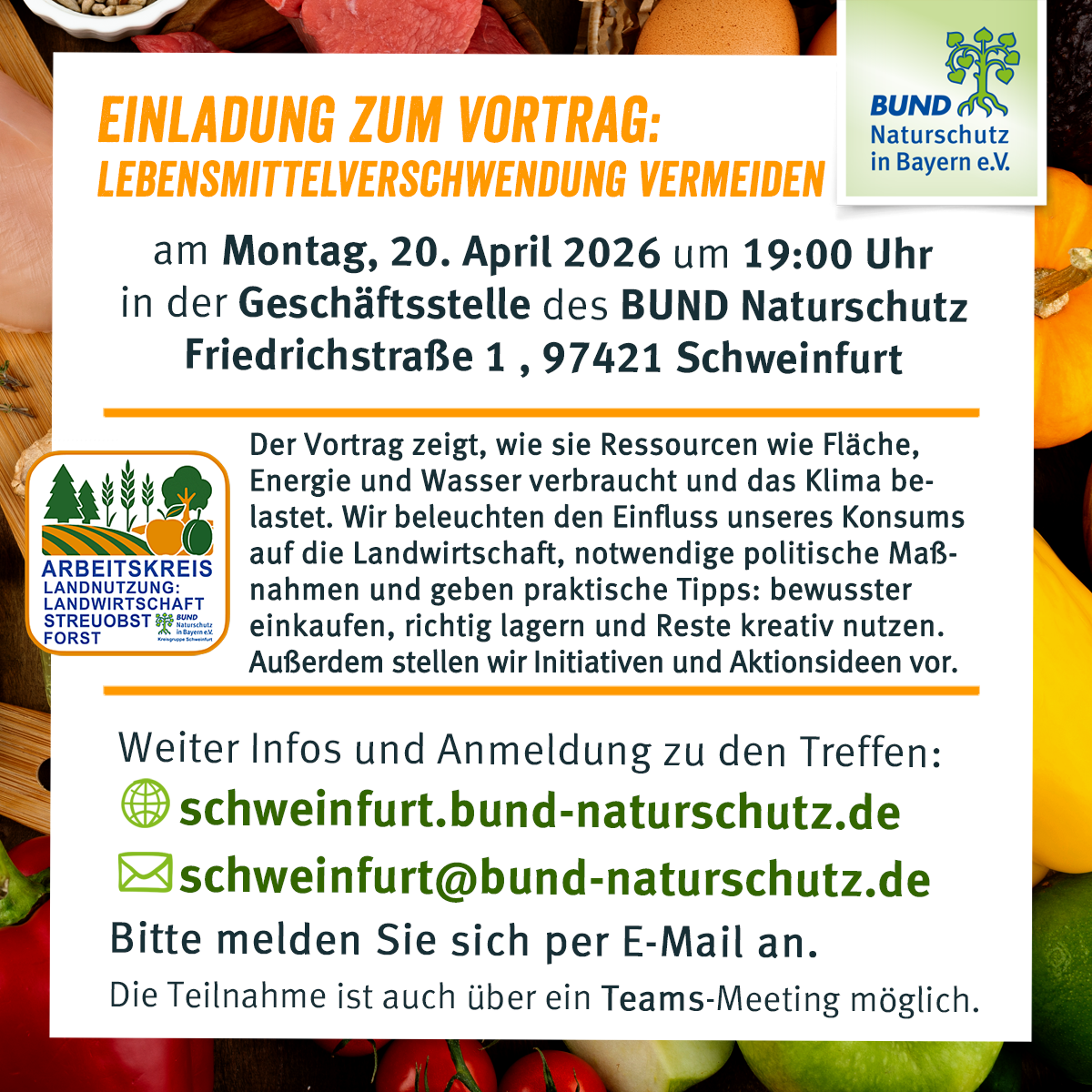 Im Vortrag zeigen wir, warum Lebensmittelverschwendung ein reales Problem ist, enorme Ressourcen wie Fläche, Energie, Wasser und Biodiversität kostet und damit auch das Klima belastet. Es geht darum, wie unser Konsum die Landwirtschaft beeinflusst, welche politischen Regeln nötig wären und wie jede und jeder durch bewusstes Einkaufen, richtige Lagerung und kreative Resteküche Abfälle reduzieren kann. Vorgestellt werden zudem praktische Initiativen und Aktionsideen.