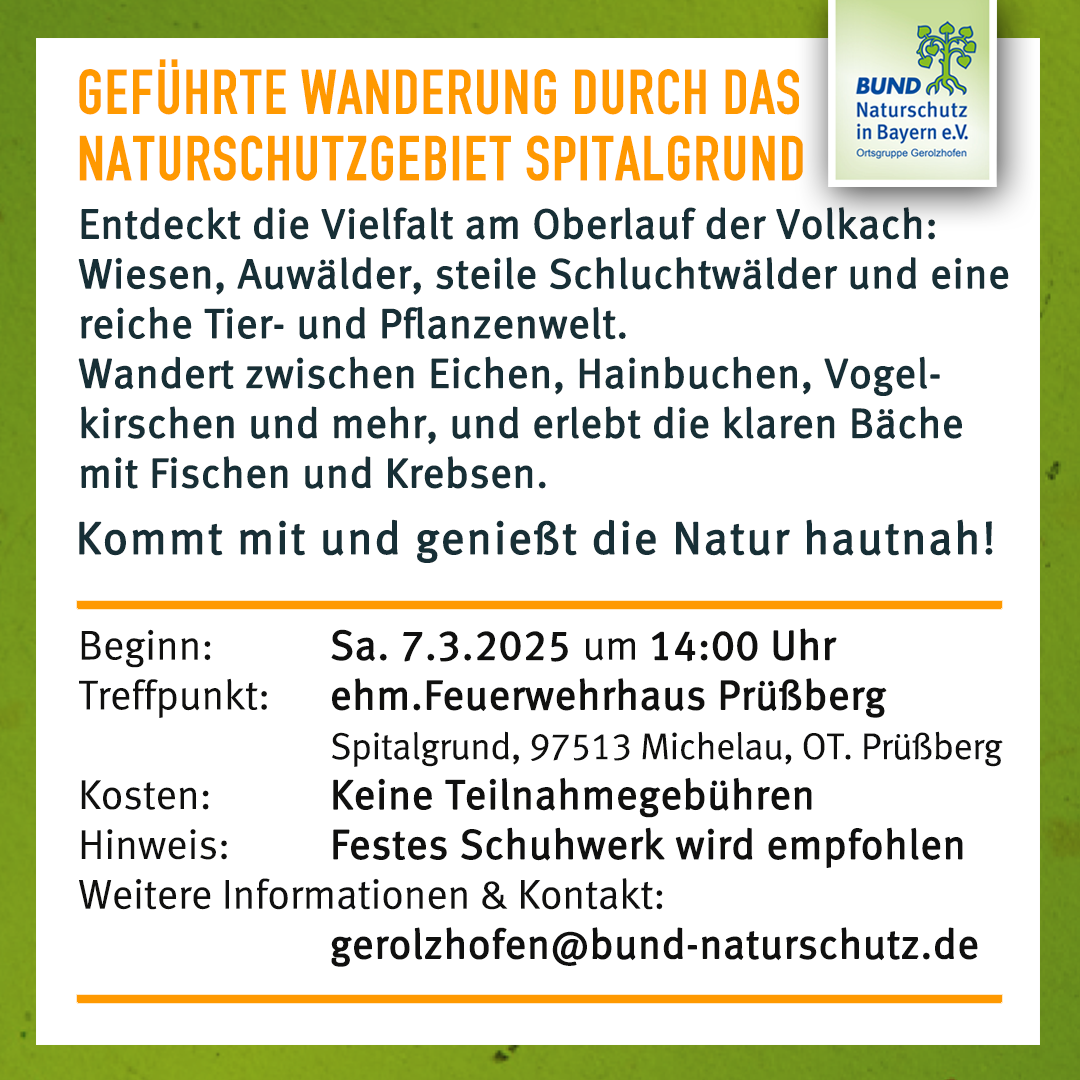 Das Gebiet am Oberlauf der Volkach umfasst Wiesen, Auwälder und steile Schluchtenwälder. Wir wandern zwischen Eichen, Hainbuche, Vogelkirsche und Winterlinde, Bergulme und Elsbeere. Die Bäche bieten Platz für reichlich Fische und Krebse. Viele Vögel sind hier heimisch. Seht es euch selbst an!