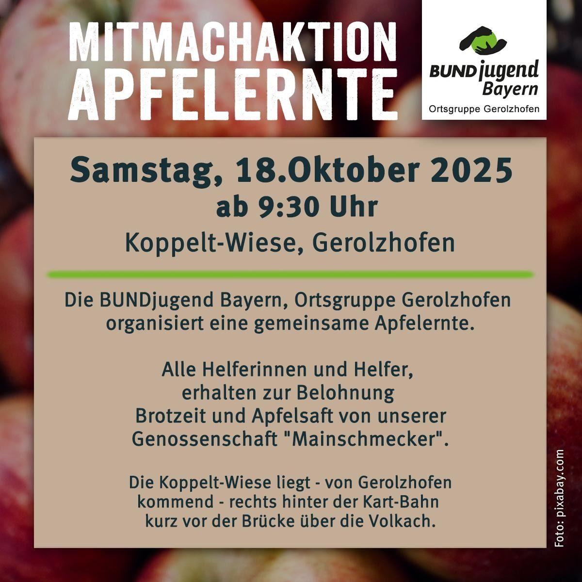 Am Samstag, 18. Oktober, ab 9.30 Uhr, organisiert die BUNDjugend Gerolzhofen eine zweite gemeinsame Apfelernte auf der Koppelt-Wiese.